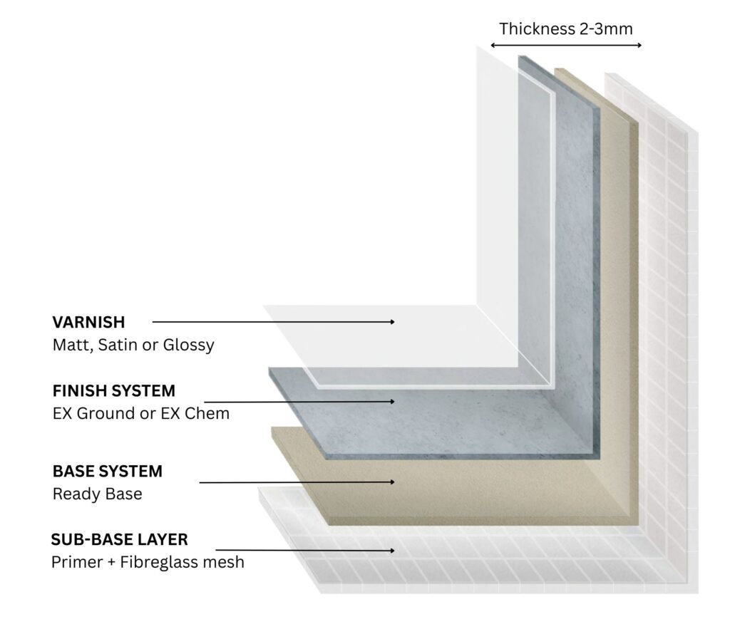 The decorative microcement layer that defines the final texture, colour, and aesthetic. Applied by trowel for a natural, handcrafted finish.